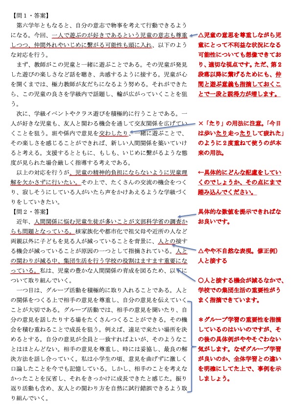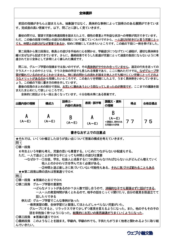 以下で、受講生にお返しする、「①添削答案」と「②講評シート」の、サンプルをPDFで見ることが出来ます。