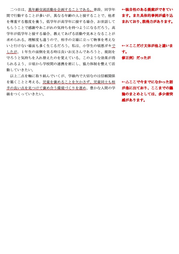「書き直す上での注意点」では受講生の答案を元に模範的な答案構成の一例を示しています。単に「ここはもっと具体的に書いてください」という指摘だけでは、書きなれていない人は「どういう言葉で書けば具体的と言えるのか」と、先に進めなくなってしまいます。「こういうことを書けばいいのか」と納得してもらえるよう、修正すべき点に模範的な構成例を書き入れています。これが、当塾が「丁寧でわかりやすい」と評価されている点です。